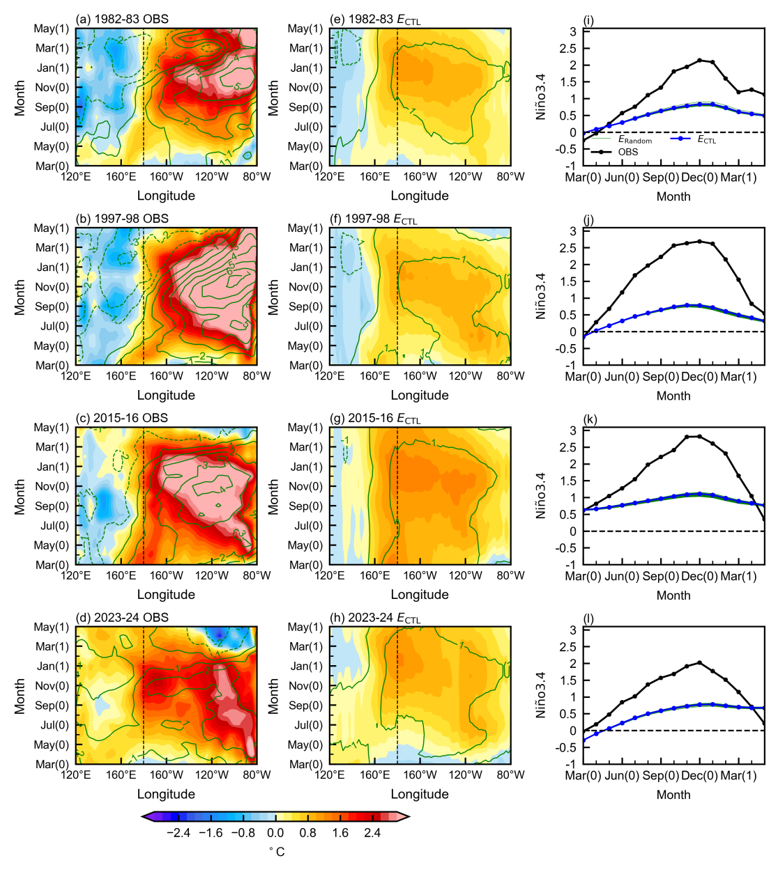 图1.(a-d)四次强厄尔尼诺(El Niño)期间的SST异常(填色)和上层150米平均海温异常(T150;等值线)随时间的演变。(e-h)3D-Geoformer模型从3月起报得到的预测结果。(i-l)四次事件中Niño3.4指数随时间的演变:黑线为观测值,蓝线为控制预测值,绿色线为添加随机初始扰动的预测。