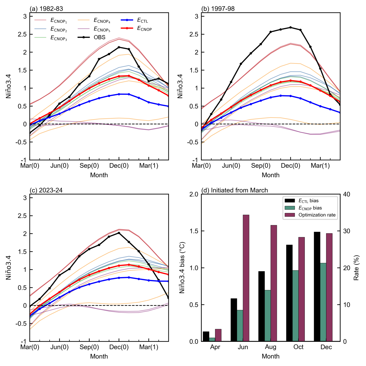 研究选取了发生在1982/83、1997/98、2015/16和2023/24年的四次强El Niño事件作为案例,系统评估了该方案对改善DL模型来预测El Niño的有效性。结果显示,当DL模型从春季起报时,基于CNOP的集合预报可将Niño3.4的预测误差降低30%以上(图3-4),并系统改善了对热带太平洋三维海温场的预测精度。