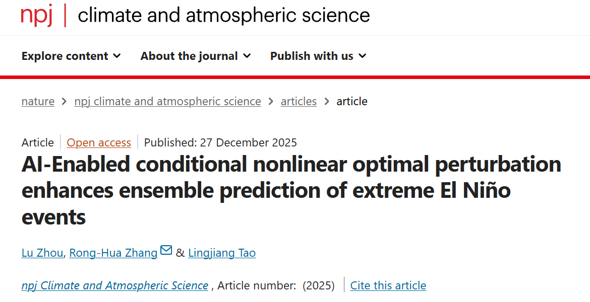近期,实验室次季节-年际气候预测团队张荣华教授和周路、陶灵江博士在中国科学院一区TOP期刊《npj Climate and Atmospheric Science》发表题为“AI-Enabled conditional nonlinear optimal perturbation enhances ensemble prediction of extreme El Niño events”的研究论文。该研究将正交条件非线性最优扰动(CNOP)技术与AI模型结合,成功研发了基于CNOP初值扰动方案的AI集合预报新方法,有效改进了极端厄尔尼诺(El Niño)事件的强度预报并减小其模拟偏差。该研究为改善确定性AI气象/气候大模型的极端事件预报能力提供了一种通用有效的解决思路。主要内容如下: