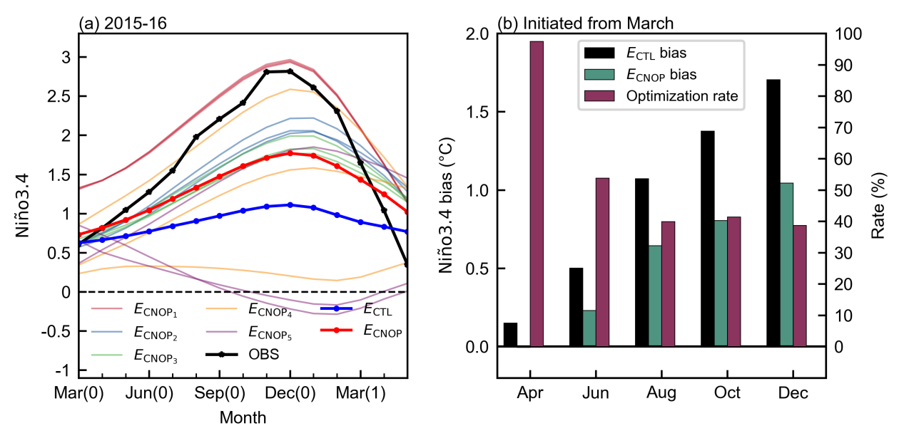 如何克服DL模型的正则化效应并实现初始扰动有效增长,成为构建DL集合预报系统的核心难题。本研究提出了一种基于CNOP方法的初值扰动方案(图2),并将其应用到DL模型的集合预报中,以提升对极端厄尔尼诺事件的预测能力。CNOP方法考虑了非线性过程的影响,能够在约束条件下合理而有效求解非线性最优增长的数值解,以最小的初值扰动能量获得最大的预报误差的增长,集合成员的分布具有明确的动力学特性。