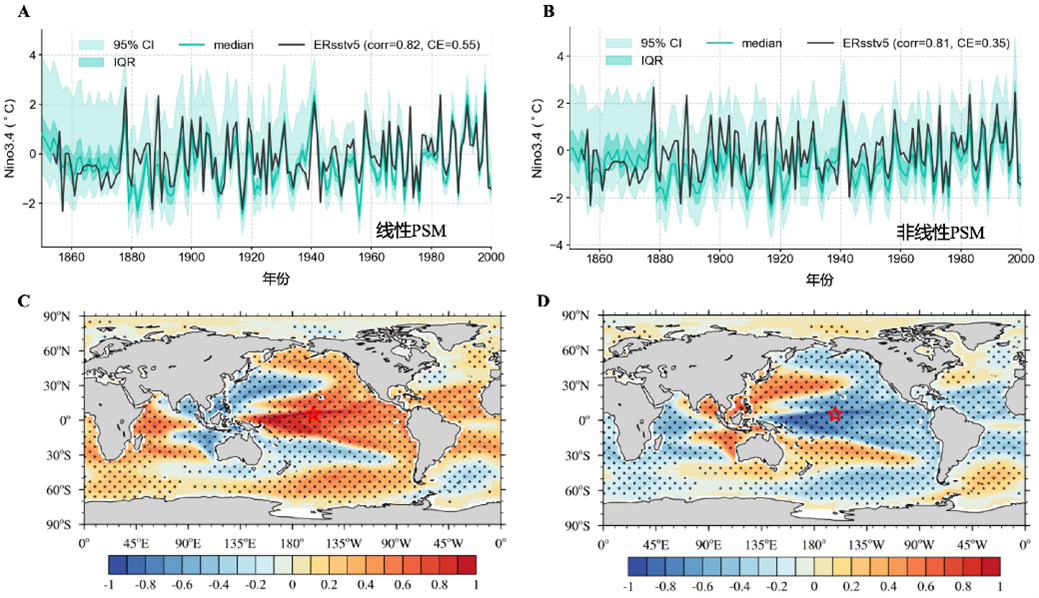 图2基于线性PSM(A)和非线性PSM(B)的观测时段Nino3.4指数同化结果对比,以及表征同化所用协方差矩阵的点面相关空间场(C,D),图D中,在计算相关系数之前,海水的δ18Osw已转化为珊瑚δ18Oc