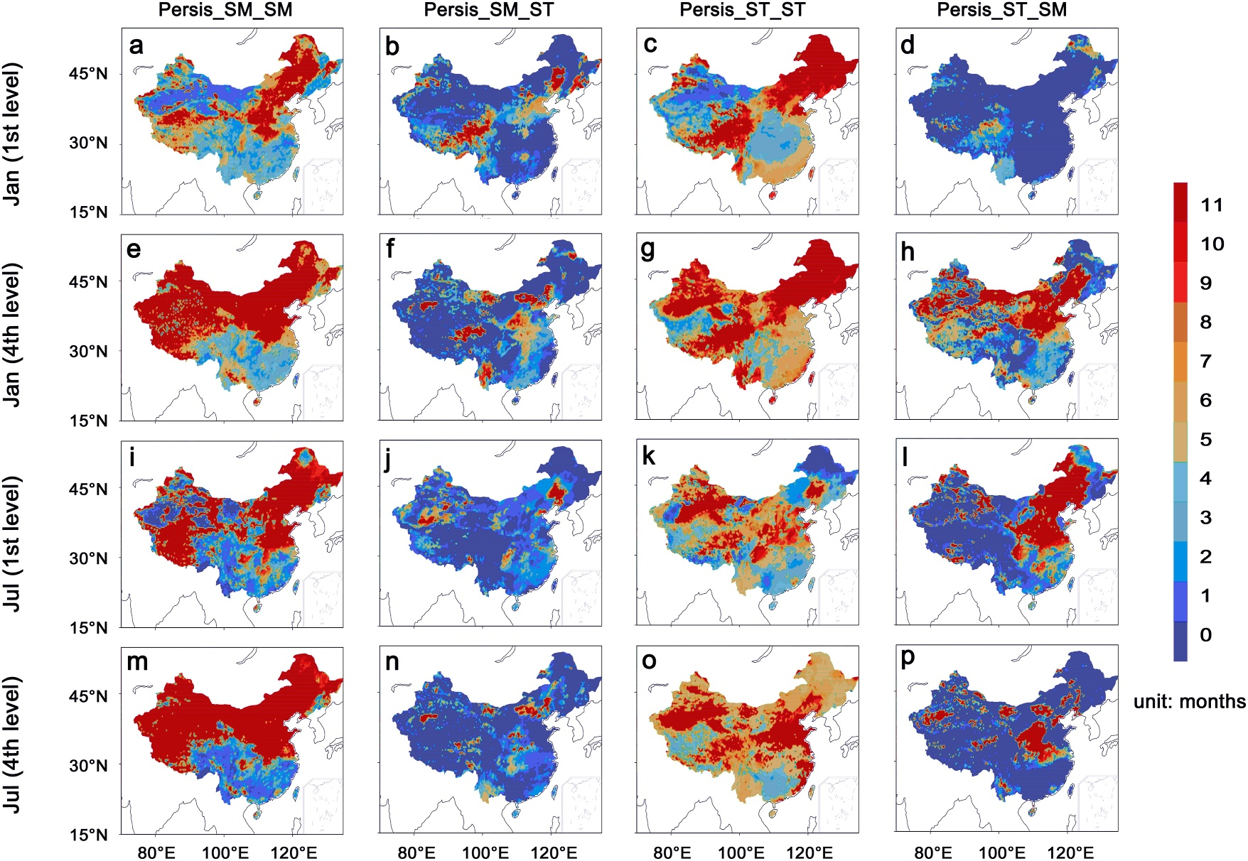 图1. 土壤湿度与土壤温度异常信号在后续土壤湿度或土壤温度中的记忆。第一至第四列分别对应土壤湿度在后续土壤湿度中的记忆(Persis_SM_SM)、土壤湿度在后续土壤温度中的记忆(Persis_SM_ST)、土壤温度异常在后续土壤温度中的记忆(Persis_ST_ST)、土壤温度异常在后续土壤湿度中的记忆(Persis_ST_SM)。第一、二行分别对应1月第一层及第四层土壤的土壤湿度/温度记忆,第三、四行分别对应7月第一层及第四层土壤的土壤湿度/温度记忆。
