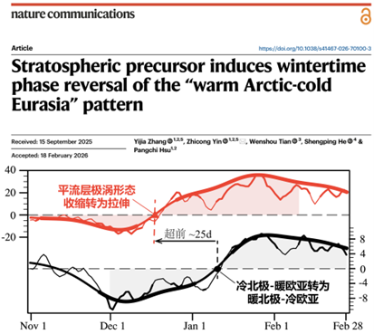 Zhang, Y. J., Yin, Z. C., Tian, W. S.,He, S. P.,Hsu, P.-C., 2026. Stratospheric precursor induces wintertime phase reversal of the “warm Arctic-cold Eurasia” pattern.Nature Communications, 17: 3284.